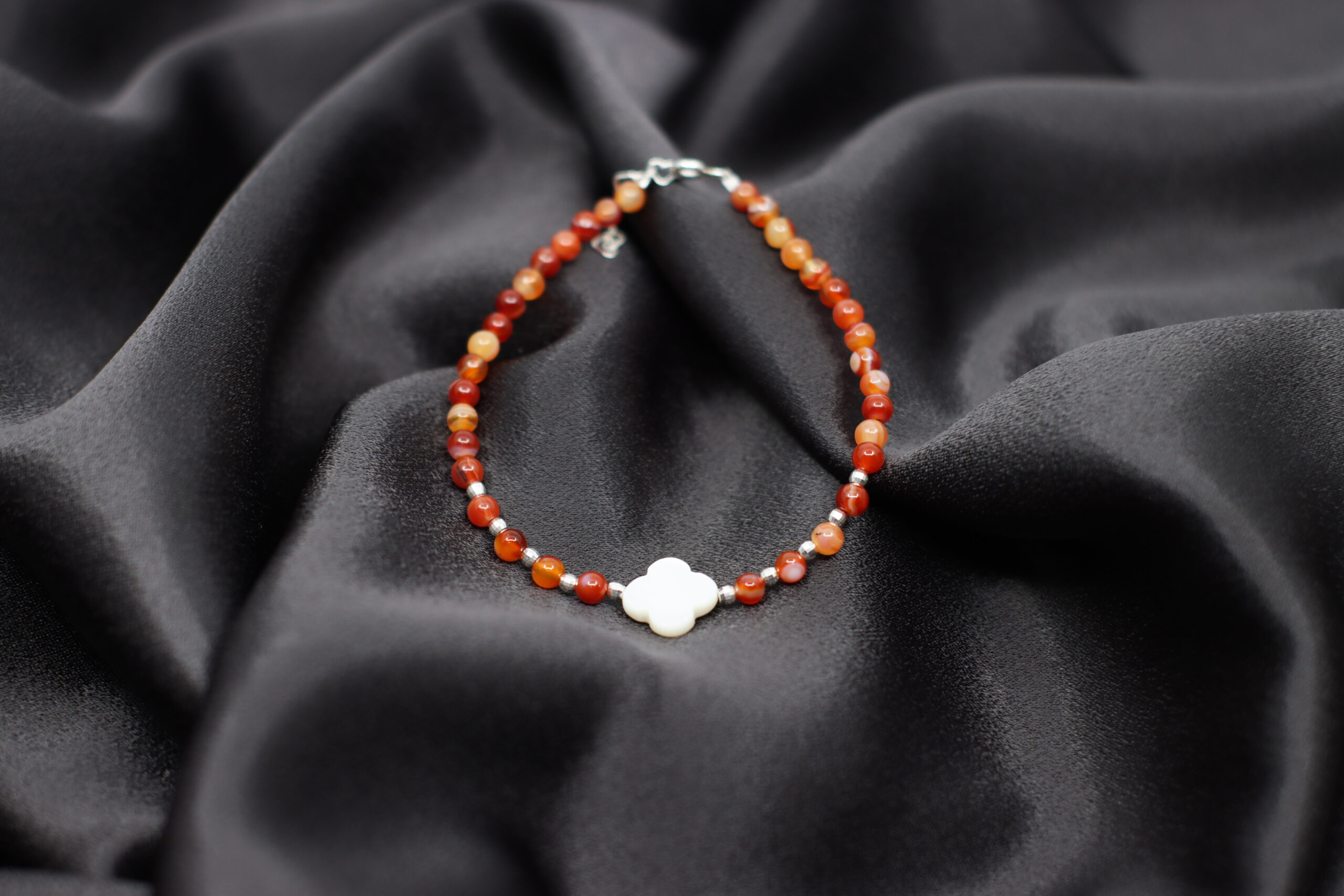 Materiale: agat caramiziu, biluțe din argint, trifoi sidef