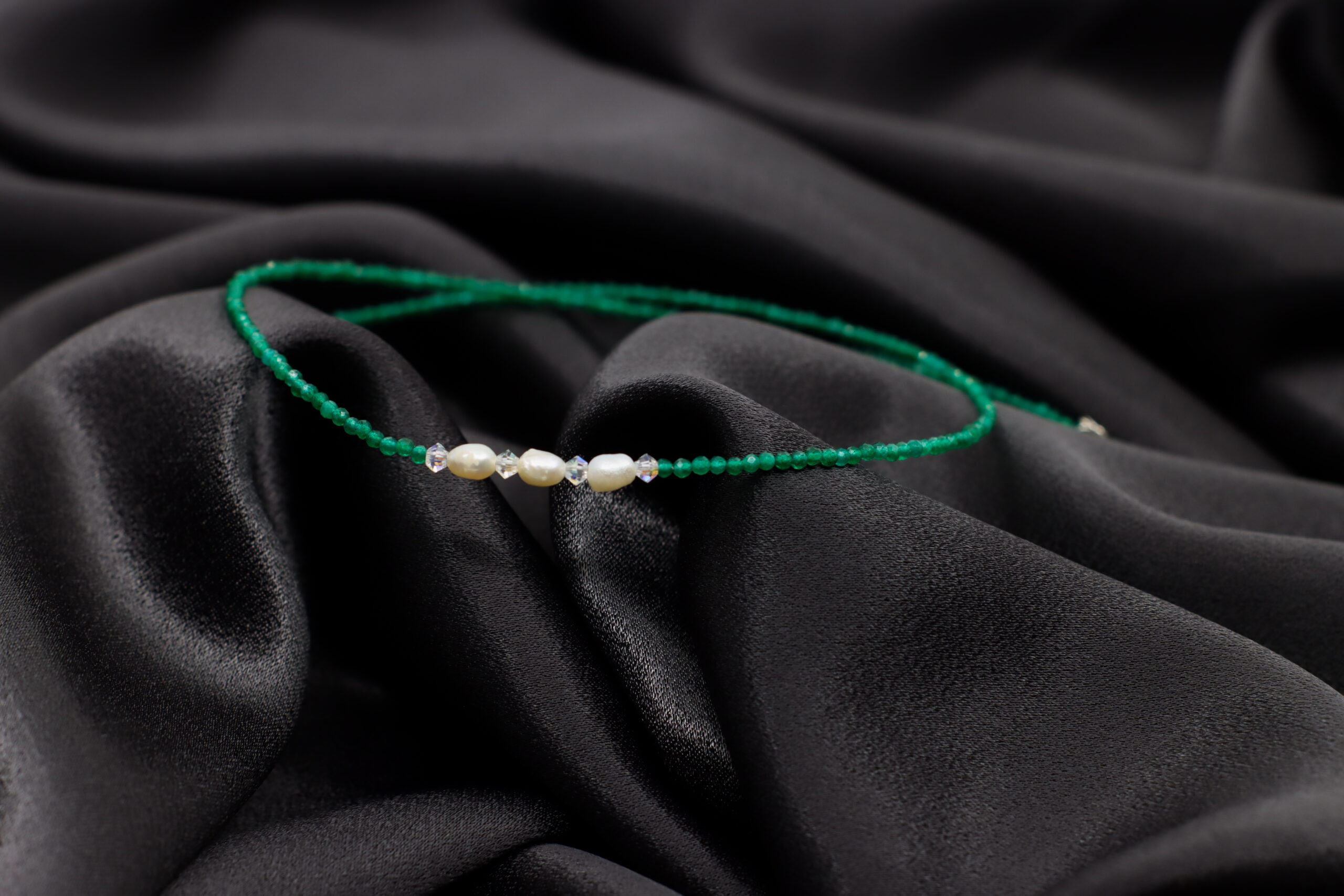 „Emerald Calm” imbina frumusetea vibranta a agatului verde fatetat cu delicatețea perlelor de cultura si stralucirea cristalelelor Preciosa. Contrastul dintre texturile naturale si accentele pretioase creeaza o armonie vizuala care aduce un aer fresh si sofisticat oricarei tinute. Ideal pentru cei care apreciaza eleganta discreta cu o nota de vitalitate si energie pozitiva.