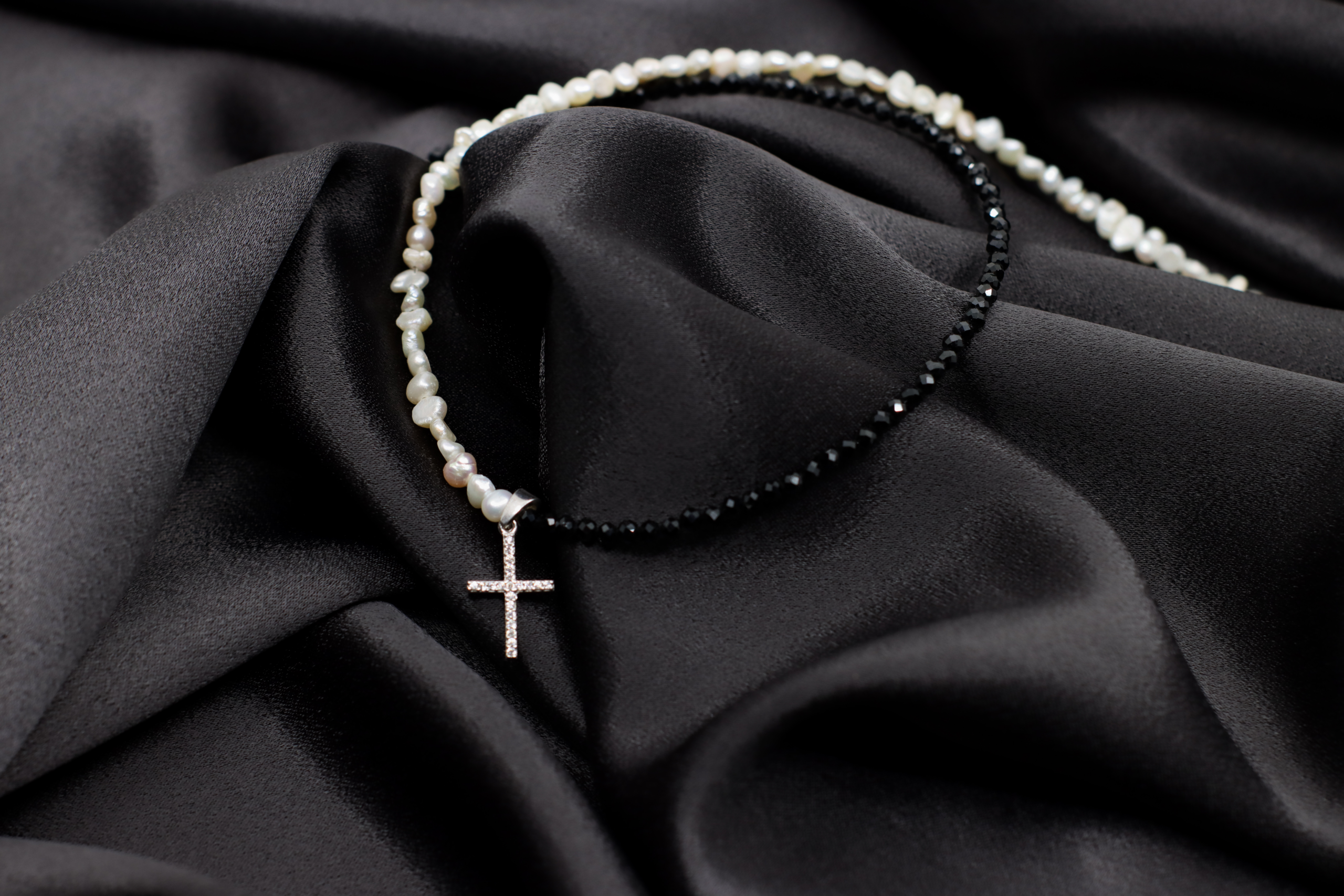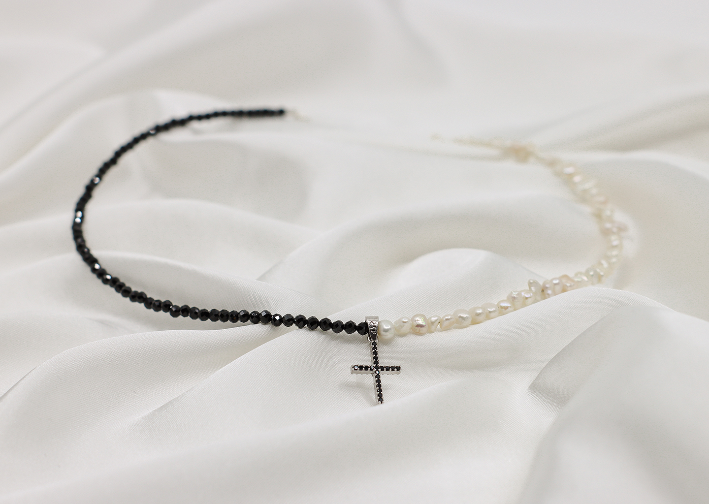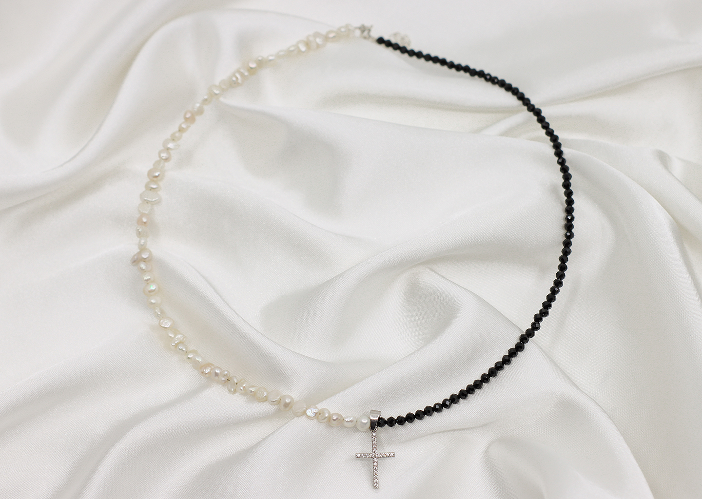 Materiale: sfere fatetate din onix, perle de cultura, cruciulita de argint cu zirconiu alb și zirconiu negru