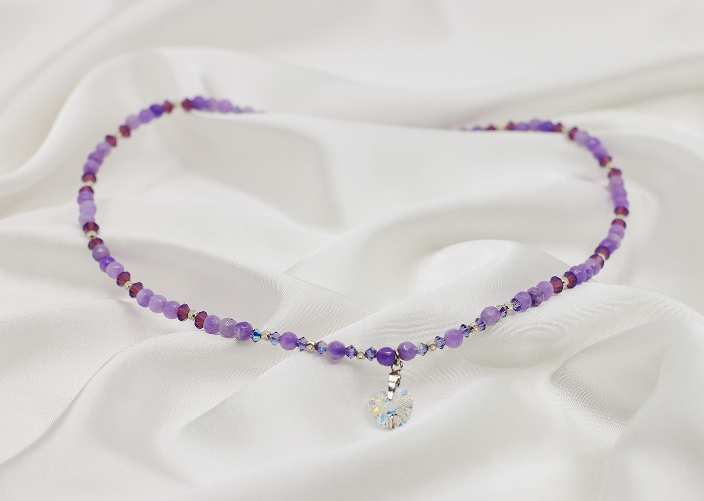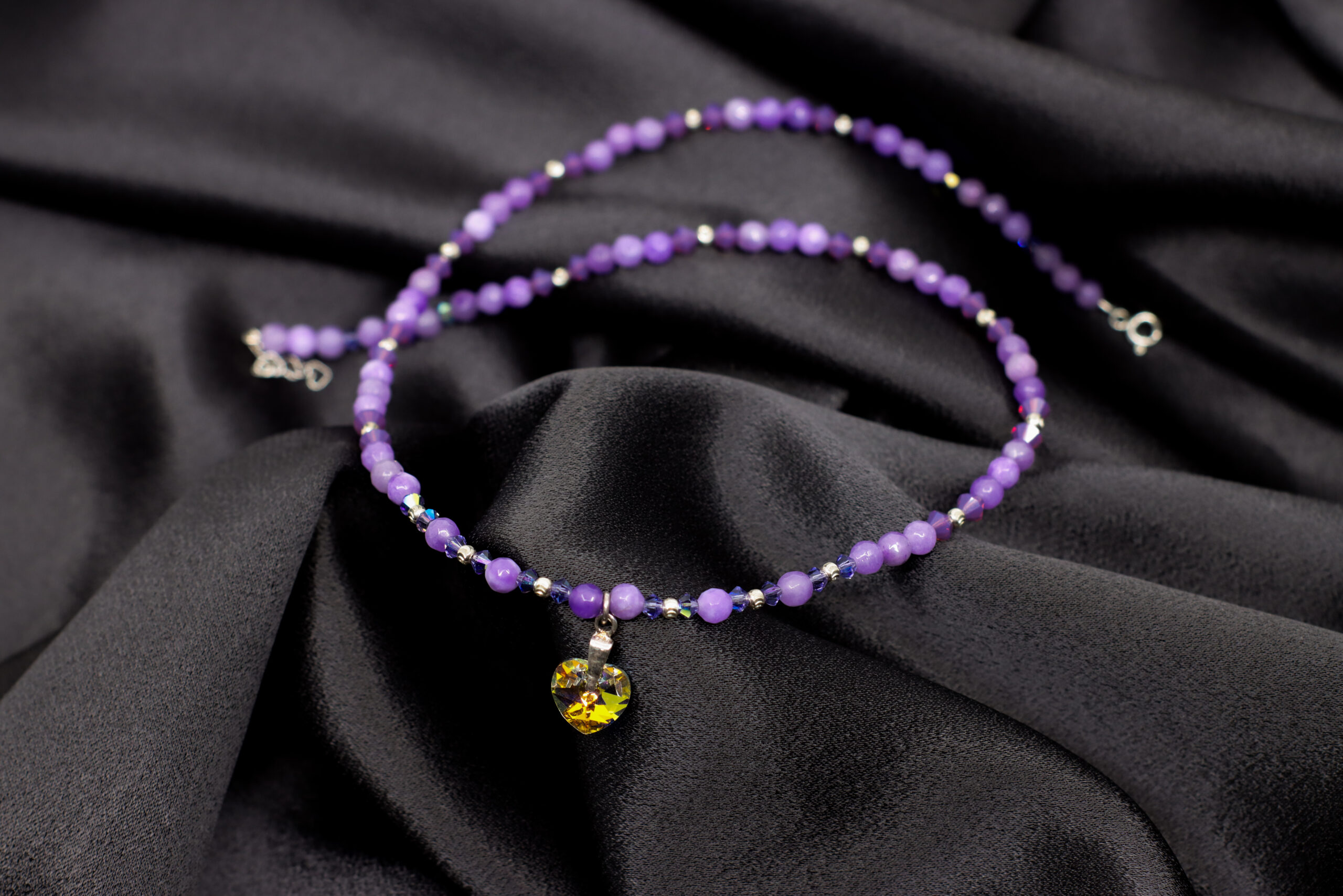 Materiale: sfere fatetate agat mov, cristale Preciosa, bilute argint, pandantiv inima Preciosa