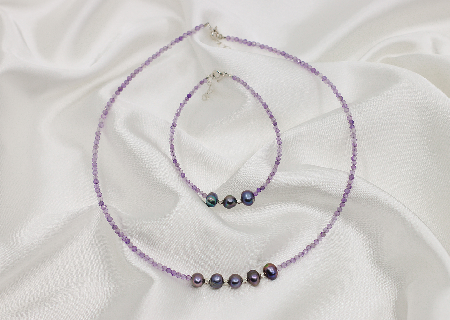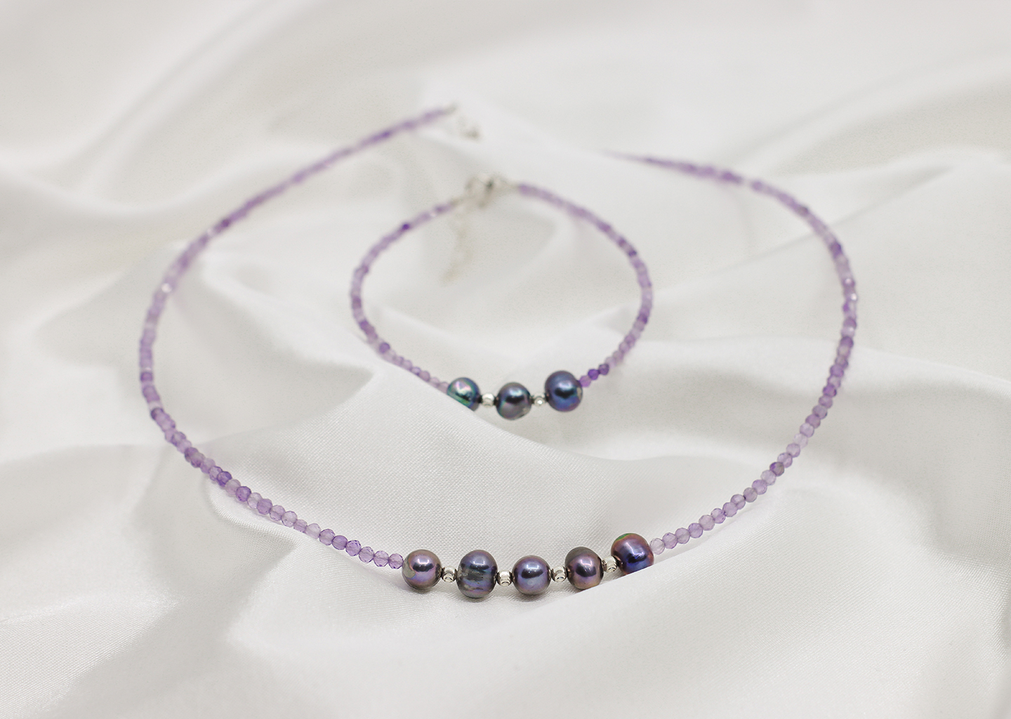 „Amethyst Serenity” este un set rafinat care combina frumusetea intensa a ametistului cu delicatetea perlelor de cultura in nuanta negru-petrol. Bilutele din argint adauga o nota moderna, completand perfect amestecul de culori si texturi. Acest set este alegerea ideala pentru o apartie eleganta si sofisticata, ideal pentru ocazii speciale sau cadouri deosebite.