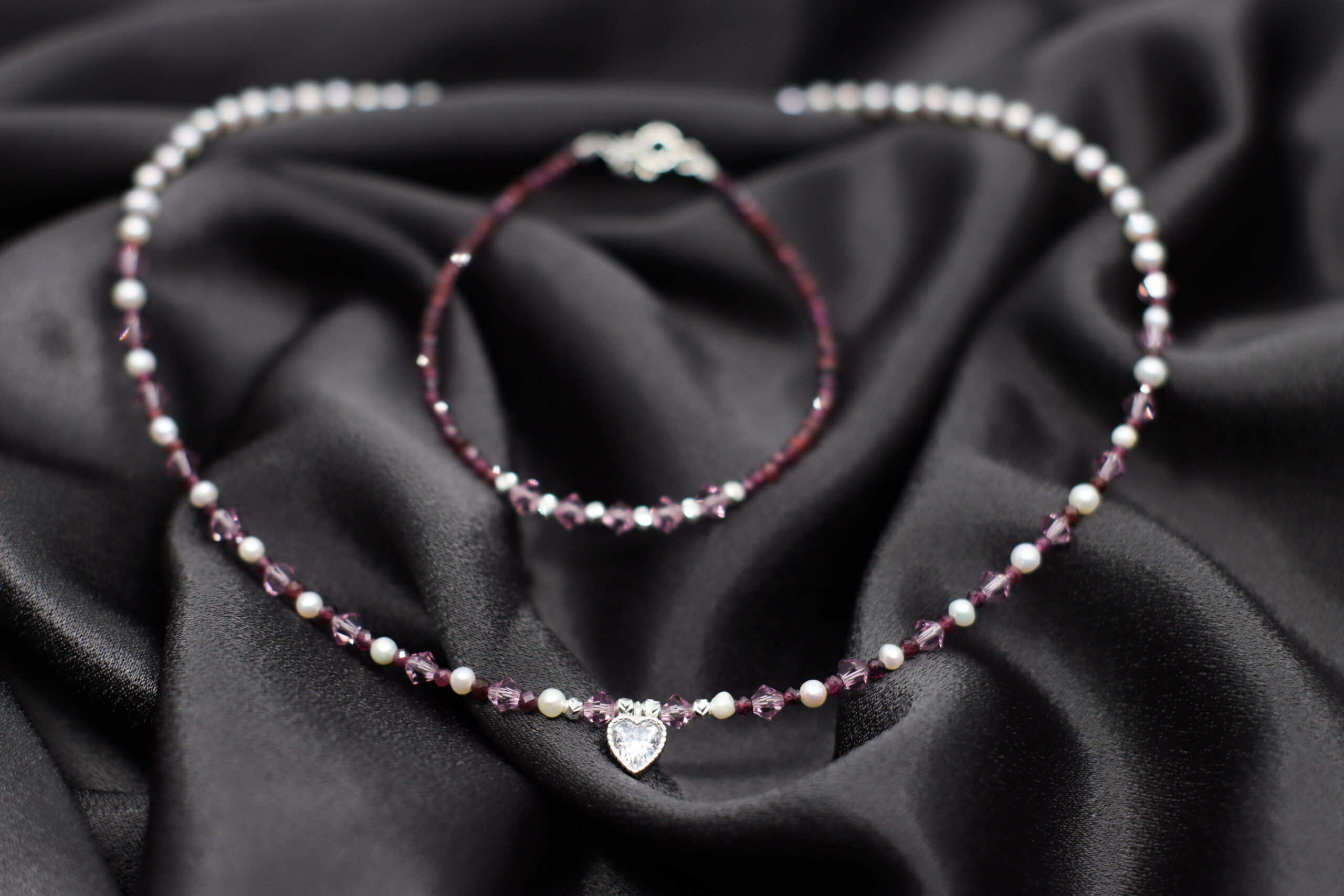 Materiale: perle de cultura, granat, cristale Preciosa, inima din zirconiu alb